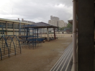 4時間目、3年生が運動場で練習をしていたとき、突然黒い雲がかかり、大雨となりました。子どもたちは走って校舎に逃げ込みました。30分後の空と比較してください。