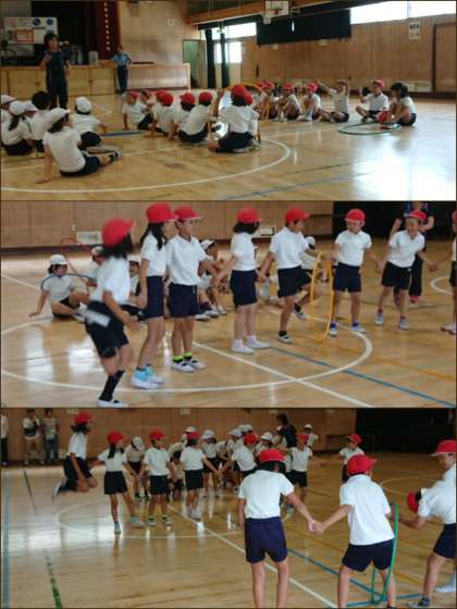 フープ送りとは、隣り同士手をつないで、その手を離さず、先頭から最後までフープを送っていくというものです。手や足、体全体を器用に動かしてフープ送りをしていました。どのチームも声を掛け合い仲良く頑張っていました。