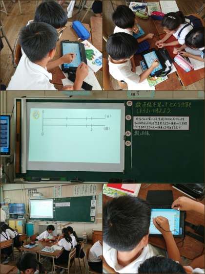 1組では、この単元の学習に毎時間タブレットを使って学習しています。今日も班ごと分かれ、タブレットに先生から配信された数直線に、書いたり消したりしながら話し合ってもんだい解決に取り組んでいました。