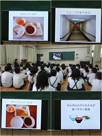 初めに、光陽支援学校の先生から、支援学校での学習の様子や、そこで学ぶ子どもたちの事、学校の給食や設備にもいろいろな工夫があることなどを教えてもらいました。