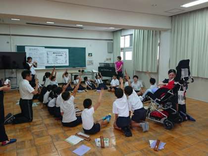 「同じように町の中にも体の不自由な人のために工夫していることに気付いたことは、ありませんか?」という問いかけには、たくさんの子どもたちが手を挙げて気付いたことを発表していました。