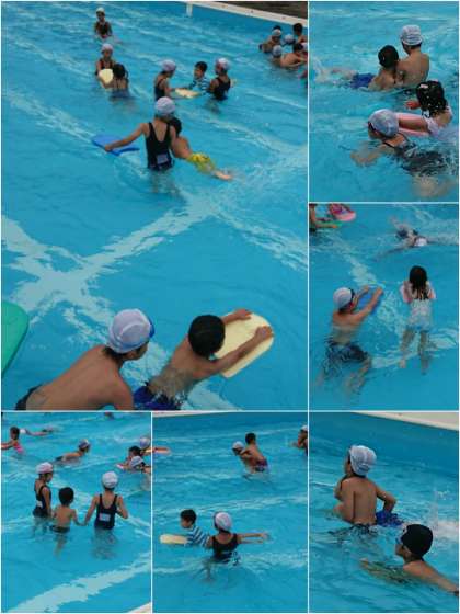 自由時間には、ビート板を使って泳ぎを教えてあげたり、水が少し苦手な園児さんをおんぶしたり、あちらこちらで素敵なお兄さん、お姉さんの姿がありました。