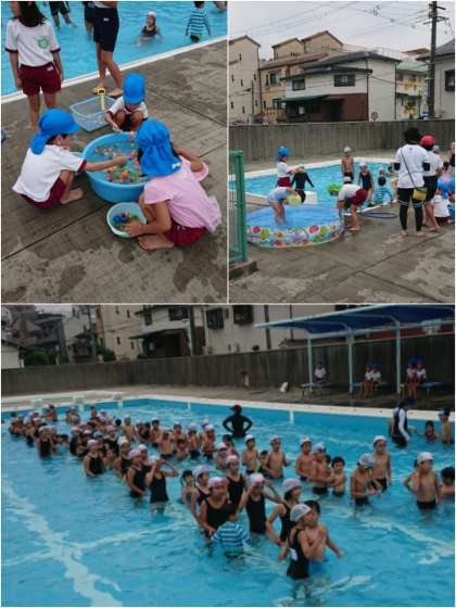 7月3日(水)5年生が城東幼稚園の園児さんたちと一緒にプールに入りました。