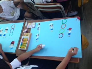 運動会の絵をかきました。まだ途中です。何の絵でしょう?