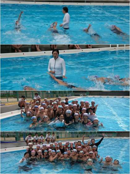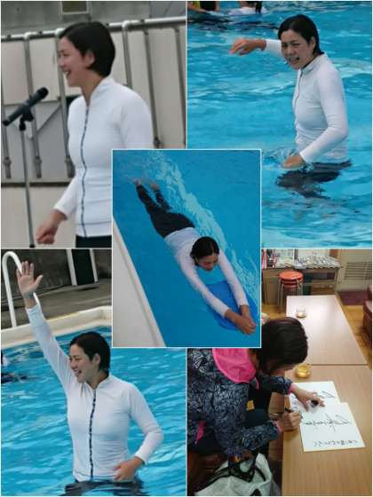 今日は、クロールの泳ぎ方について、実技指導をしてもらいました。軽快な口調で、笑いも交えながら、無理せず楽に泳ぐための手や足の動かし方、呼吸の仕方など、楽しくたくさんのコツを教わりました。
