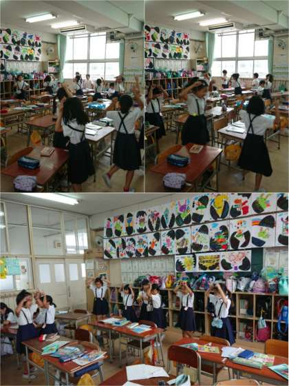 2時間目と3時間目の間に、給食の後に、それぞれ20分の休み時間があります。来週18日(木)の児童集会までは、この時間にも盆踊りソング『牛ちゃんマンボ』を流しています。