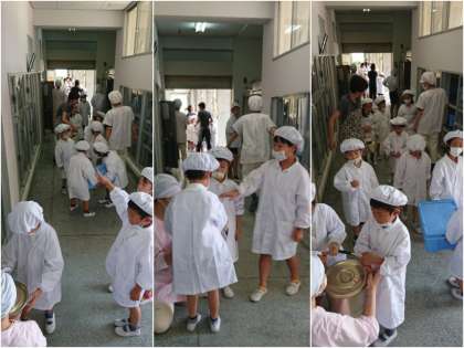 4時間目が終わって、給食室では、当番の1年生が調理員さんから給食を受け取り、小さな体で頑張って教室へ重い給食を運んでいました。