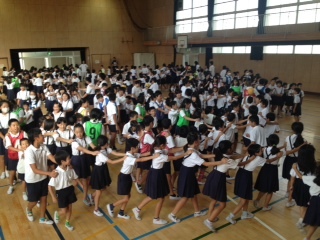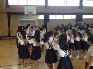 全校児童が体育館に集まって、じゃんけん遊びをしました。1年生から6年生までの児童が「ともだちグループ」を作っています。秋の遠足はこの「ともだちグループ」で鶴見緑地に行く予定です。