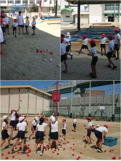 次に、早く話し合いが終わったチームから、運動場はもちろん廊下なども利用して、自主的に、人間モーグル、ボッチャ、玉入れ、大玉転がしなどの練習が始まりました。どのチームも練習場所に誘導したり、練習の指揮をとったり、掛け声をかけたりと、高学年の子どもたちが率先してチームをまとめようとする姿が見られました。