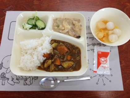 新しいメニューの試食がありました。「米粉カレーライス」「豆乳グラタン」「グリーンサラダ」「フルーツ白玉」でした。いろいろなアレルギーに配慮したメニューのひとつでした。