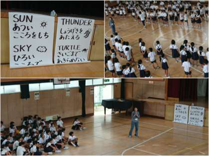 その間、1〜4年生は、体育館で、応援の歌や、掛け声の練習をしました。本番の声の調子が少し心配になるほどの元気な声で頑張っていました。