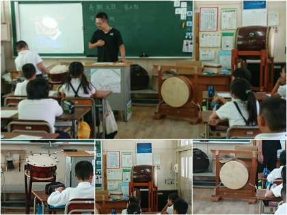 4年生では、実際に太鼓に触れたり、ビデオで、太鼓の作り方を見たり、太鼓作りの職人さんの話を聴いたりして学習をします。