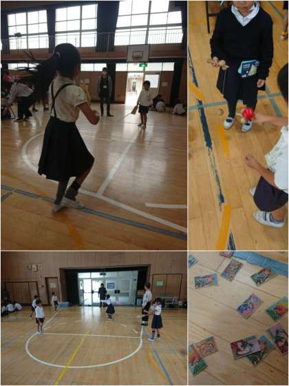 2、3時間目、体育館では1年生が昔遊びを体験しました。