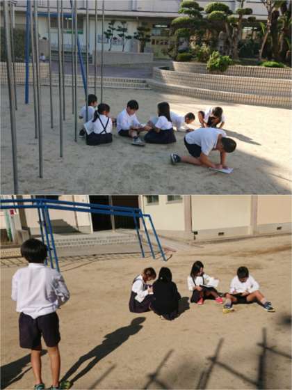 違いを調べていくうちに、落ちている葉っぱの様子が違う!」、「ほら、地面の土の色が違う!」など、教科書にも書かれていないような違いをどんどん発見していく様子も見られました。