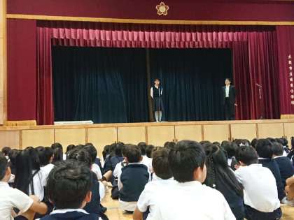 校長先生からは、「このふたつの言葉を話すことができるようになれば世界中の人と友達になれますね。」とお話がありました。