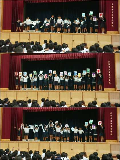ひとつ目は、英語です。夏休み、ウェルミナ・ジュニアカップという英語の暗唱大会に出場した児童が、全校児童の前で『Hands to work and