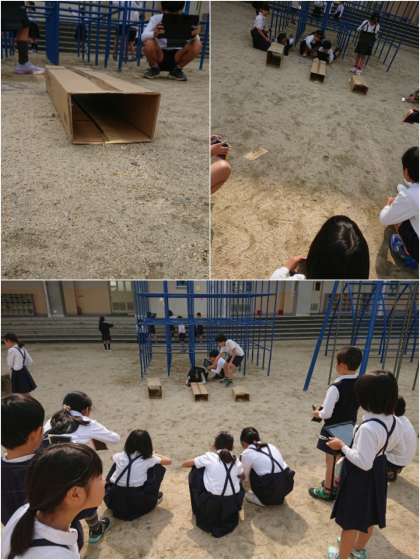 今日は、学習の導入として、鏡の反射を利用して、「光の的あて」や、「光とトンネルくぐり」、目隠しをして「光が当たっているかなクイズ」などをして遊びました。