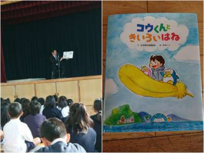 現在、読書週間中です。先週は「絵本の広場」を開催したくさんの絵本に親しみました。来週は、城東小学校図書館ボランティア「おはなしクレヨン」の皆さんによる読み聞かせの会「おはなし会」も行われます。そして、今日は校長先生から『コウくんときいろいはね』という絵本の読み聞かせをしてもらいました。