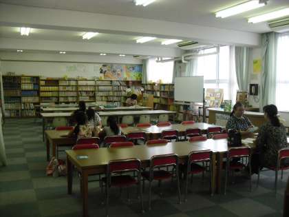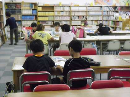 地域の図書ボランティアの皆さんのお世話で、10時から12時まで図書館を開放しています。友達と夏休みの宿題をしたり、自分の勉強をしたりして静かに過ごしています。プールと組み合わせて活用してくれたらと願います。