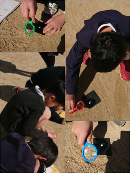 子どもたちは、虫めがねと光をあてる紙の距離を変えたり、角度を変えたりしながら、小さく光を集めると、輝くように明るくなることを見つけました。また、さらに紙が煙が出るほどに熱くなっていることに驚いていました。