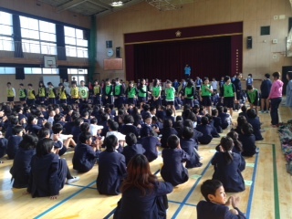 10月31日に実施した「ともだちオリエンテーリング」の表彰式がありました。一位は青の3グループ、二位は赤の4グループ、三位は青の7グループでした。表彰状とメダルが渡されました。また全員に表彰状が渡されました。