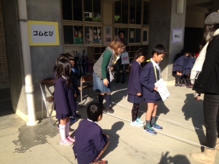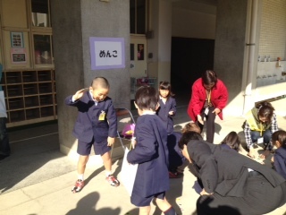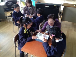 1年生ははぐくみ活動で、「昔遊び」をしました。PTAと地域の女性会にご協力いただき、コマ回しや、メンコ、あやとりなどの遊びを教えていただきました。