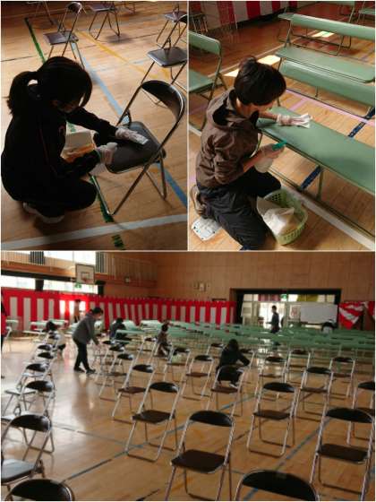 椅子はできる限り間隔を開けて配置し、消毒を行いました。