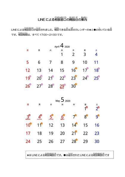 先日、教科書等配布の際にお手紙でお知らせしました「LINE相談窓口」で、相談できる日が増えましたので、お知らせします。