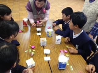 はぐくみの取り組みで、6年生がコサージュを作りました。生涯学習のみなさんとPTAのみなさんにお世話になり、卒業式で胸につけるコサージュを作ります。材料の準備などとてもお世話になりました。