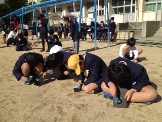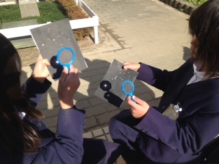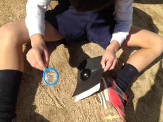 3年生が運動場で理科の実験をしていました。虫眼鏡で黒い紙を燃やす実験です。風は冷たいですが、太陽は強く照っていました。