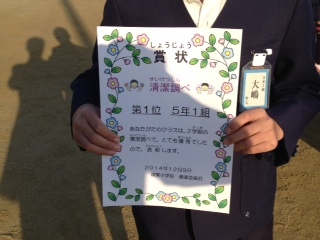健康委員会から清潔検査の表彰がありました。1位が5年1組、2位が2年2組、3位が4年2組でした。