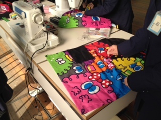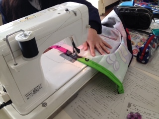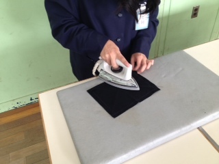 5年生が家庭科室でエプロン作りをしていました。ミシンやアイロンを使って作っています。