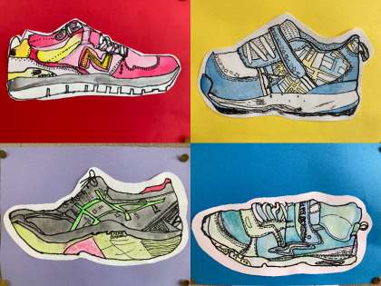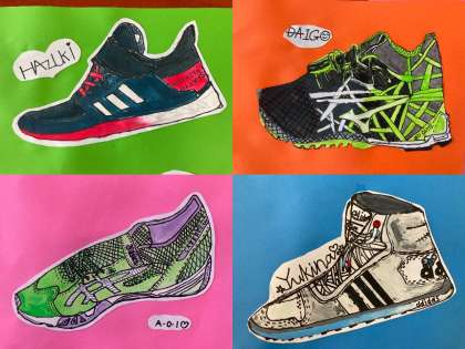 作品のテーマは、『くつをよく見て』です。テーマの通り、普段から履いている自分の靴をじっくりと観察し、素材の質感まで表現できるように表し方を考えながら、丁寧に油性ペンでデッサンしました。