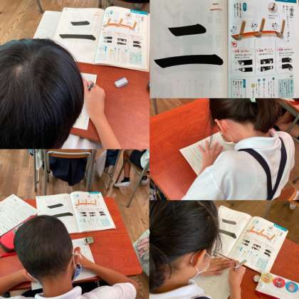 今日は、その前段階として、ビデオで『二』の書き方のコツを視聴したり、同じコツを生かして、硬筆で一画一画丁寧に「横画」の練習をしたりしました。