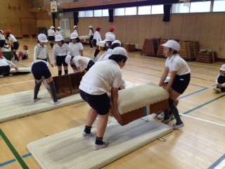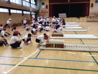 3年生が体育館で「跳び箱」をしていました。跳び箱の上で前回りをする、「台上前転」に挑戦していました。