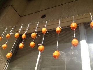 先日の「しぶ柿」が保健室前のろうかに干してありました。一年生が「しぶ柿」をなめてみたそうです。どんな味だったかな。干し柿ができたら味比べしてください。