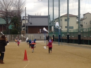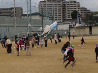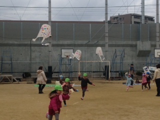 城東幼稚園の園児が、給食時間の運動場でたこ揚げをしました。