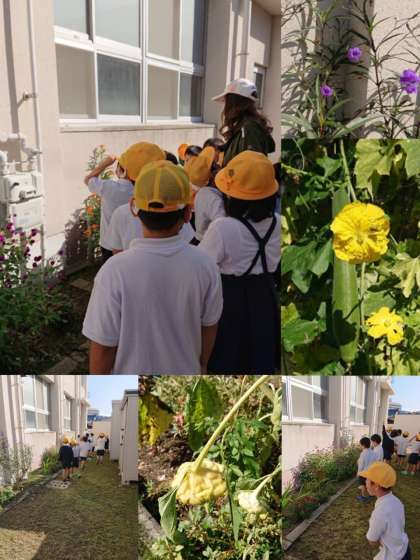 子どもたちは、色付いた柿の実、夏には太陽に向かって元気に咲いていたヒマワリのこうべを垂れた様子、黄色く色を変えてしまったツルレイシ(ゴーヤ)の実など、春や夏との違いを感じながら、身の回りにある秋の様子を見つけました。