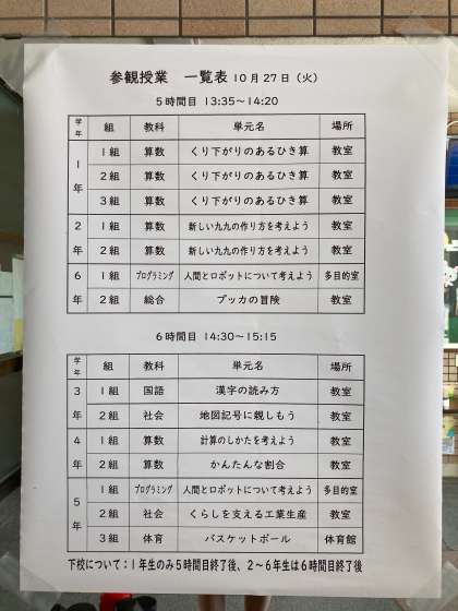 多目的室で実施の5年1組、6年1組のプログラミング学習については保護皆さま全てに公開しております。