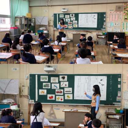 そして次に、それらの言葉を使って、「私は果物の中でりんごが好きです。」「ぼくは乗り物の中で新幹線が好きです。」などと、ひとりひとり好きな物を発表しました。