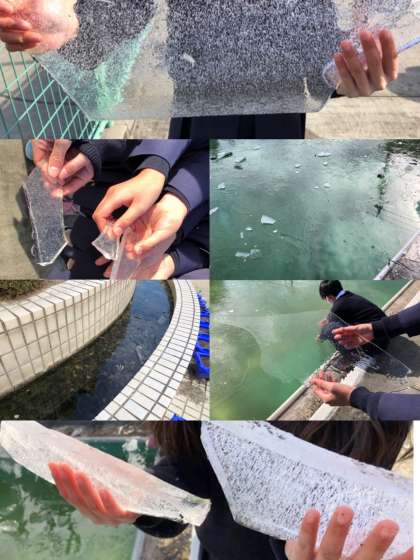 学校では、この冬初めて池やプールの水の表面に氷が張っていました。この冬初めてと書きましたが、ここ最近は寒い日でも池の水が凍っていた記憶がありません。ひょっとしたら2、3年振りの事かもしれません。