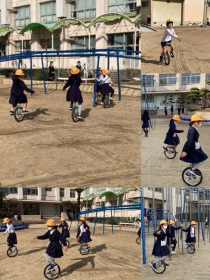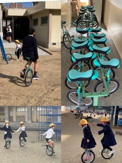1月25日(月)、老朽化していた一輪車20台を新しいものに取り替えました。今までからも休み時間のライオンランドには、一輪車の練習をする子どもの姿がたくさん見られましたが、今日は担任の先生からその知らせを聞いたより多くの子どもたちが一輪車の練習をしに集まりました。