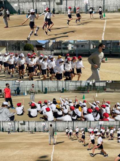 まず、準備体操で脳や身体をスイッチを入れてから、高く跳ぶスキップ、前に進むスキップなどをしました。そして、それらを通して足を上げたり、重心を前に傾ける感覚を掴んだりしてから走る動きに繋げていきました。