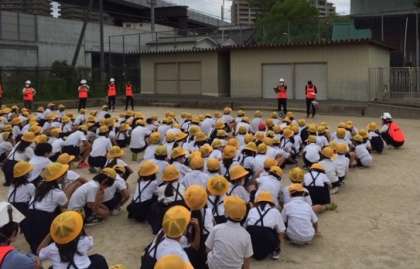 今回は給食室から出火していることを想定した訓練です。事前指導として担任からは火災の避難の仕方や煙の怖さを教わり、給食室付近には近づかずに速やかに避難できる経路を確認しました。約束事の「おはしも」(おさない はしらない しゃべらない もどらない)を徹底して避難することができました。