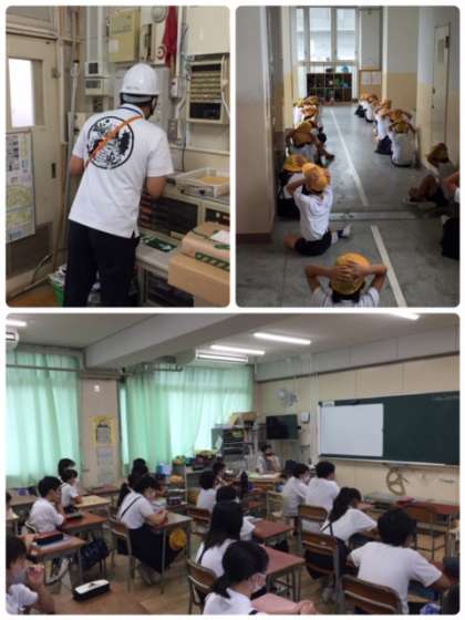 訓練内容は南海トラフ巨大地震を想定したものです。地震の強い揺れを感じると机の下に入り頭を守り、揺れのおさまりを確認すると、速やかに高い所への避難をおこない三階に移動しました。とても迅速に避難することができました。全員が無事に避難できると校長先生からの話があり、最後までしっかりと聞きいつ来るかわからない災害について再度考えることができました。