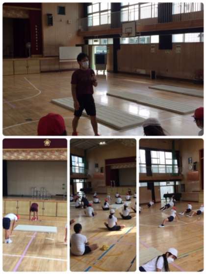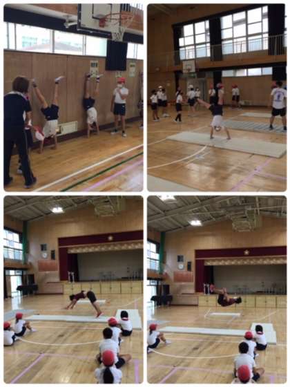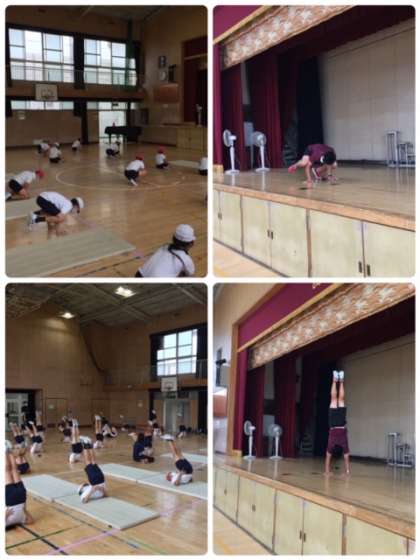 まず、ストレッチをしてしっかり身体をほぐしてから練習に入りました。かえるの足うち、背倒立、壁倒立と段階を踏んで練習をしました。どの練習もまず一度児童にやらせてみて、次に先生の手本を見せながらうまくいくポイントを伝えることで、先ほどよりうまくできるようになったと実感でき、意欲的に練習を進めることができました。