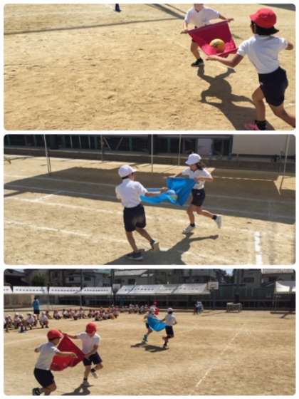 二人一組のペアになり、スタートの合図でボールを置いたままの布を持ちます。ボールを乗せたままコーンを一周し、次の走者に渡していきます。早くゴールしたチームの勝ちとなります。いかにボールを落とさずに早く運ぶことができるかがカギとなりますがすぐにボールが落ちてしまいなかなかうまく運べません。「イチニ、イチニ」とリズムをとって運ぶペアなど、児童たちで工夫をして練習に取り組んでいました。
