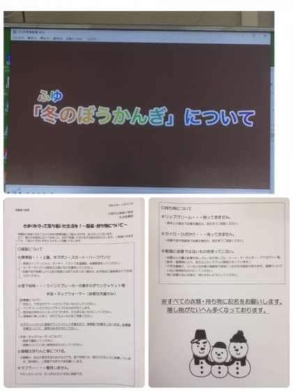 防寒着についての問い合わせも多くなってきましたので、本日冬の服装・持ち物についての手紙を配布致しました。各学級でもそれについての動画を視聴し、先生から話があったと思います。