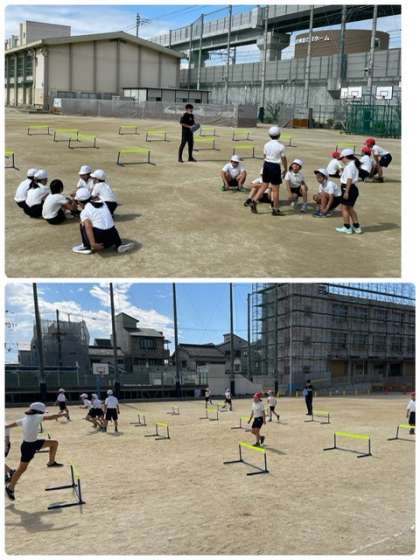 今日の目当ては「ハードル間の歩幅について」でした。児童たちはランダムに置かれたハードルでは歩幅がうまく合わないことに気づき、ハードル幅を揃えていました。その結果、歩幅が一定になり、跳びやすくなったことに気づくことができました。