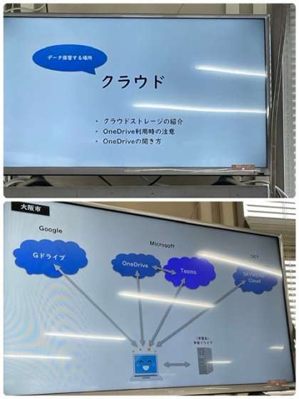 データは端末に保存するだけでなく、クラウド上に保存することで端末が変更した時や、出張先でもデータを閲覧・使用することができること。そして、その保存の仕方などを教えていただきました。これで様々な場面でもデータを活用できます。短時間の研修でしたがとても学ぶことが多い研修でした。